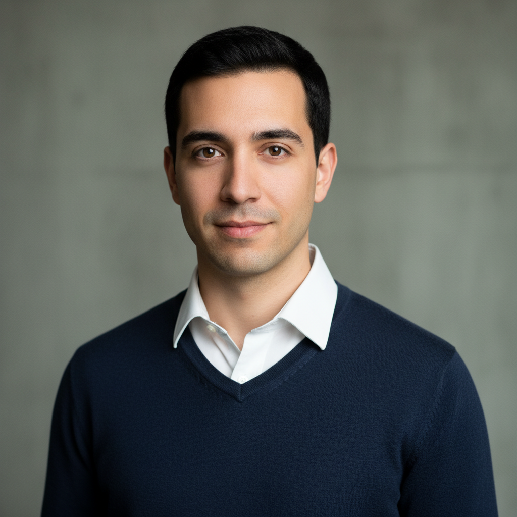 מודל (גבר), פורטרט מקצועי, הבעה בטוחה ונינוחה; לבוש סוודר דק בצבע כחול נייבי עשיר עם צווארון V, מתחתיו חולצת כותנה לבנה קלאסית, רקע אפור-ירקרק מטושטש עם טקסטורת קיר בטון עדינה, תאורת סטודיו מפוזרת היוצרת ניגודיות עדינה, אווירה מודרנית ומזמינה.התמונה תכיל רק אדם אחד.