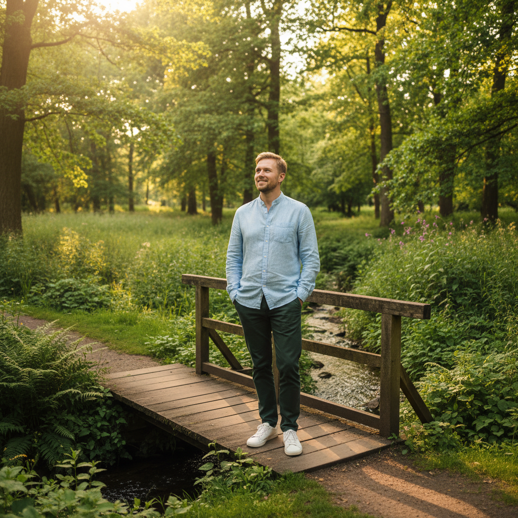 מודל גבר, לבוש סמארט-קז'ואל: חולצת כפתורים מבד פשתן בהיר בצבע תכלת, מכנסי צ'ינו ירוקים כהים, סניקרס לבנות פשוטות. עומד על גשר עץ בפארק ירוק ושופע, מואר באור שמש רך של אחר הצהריים, אווירה רגועה וטבעית.התמונה תכיל רק אדם אחד.