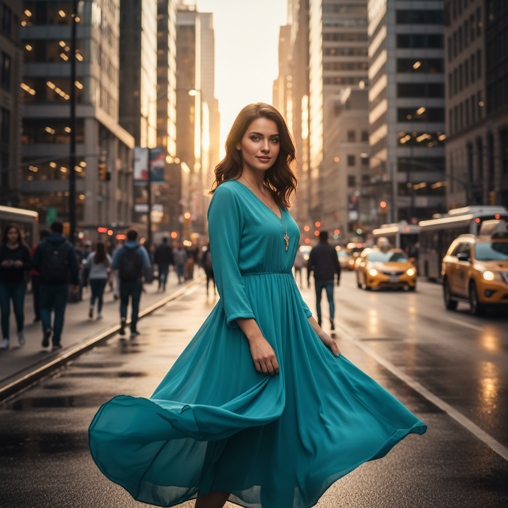 מודל אישה, לבושה בשמלת מידי זורמת בצבע טורקיז עשיר, עם שרשרת זהב עדינה. עומדת בלב רחוב עיר שוקק חיים עם ארכיטקטורה מודרנית ברקע, מוארת באור שקיעה חמים, אווירה אורבנית, אופטימית ומושכת.התמונה תכיל רק אדם אחד.