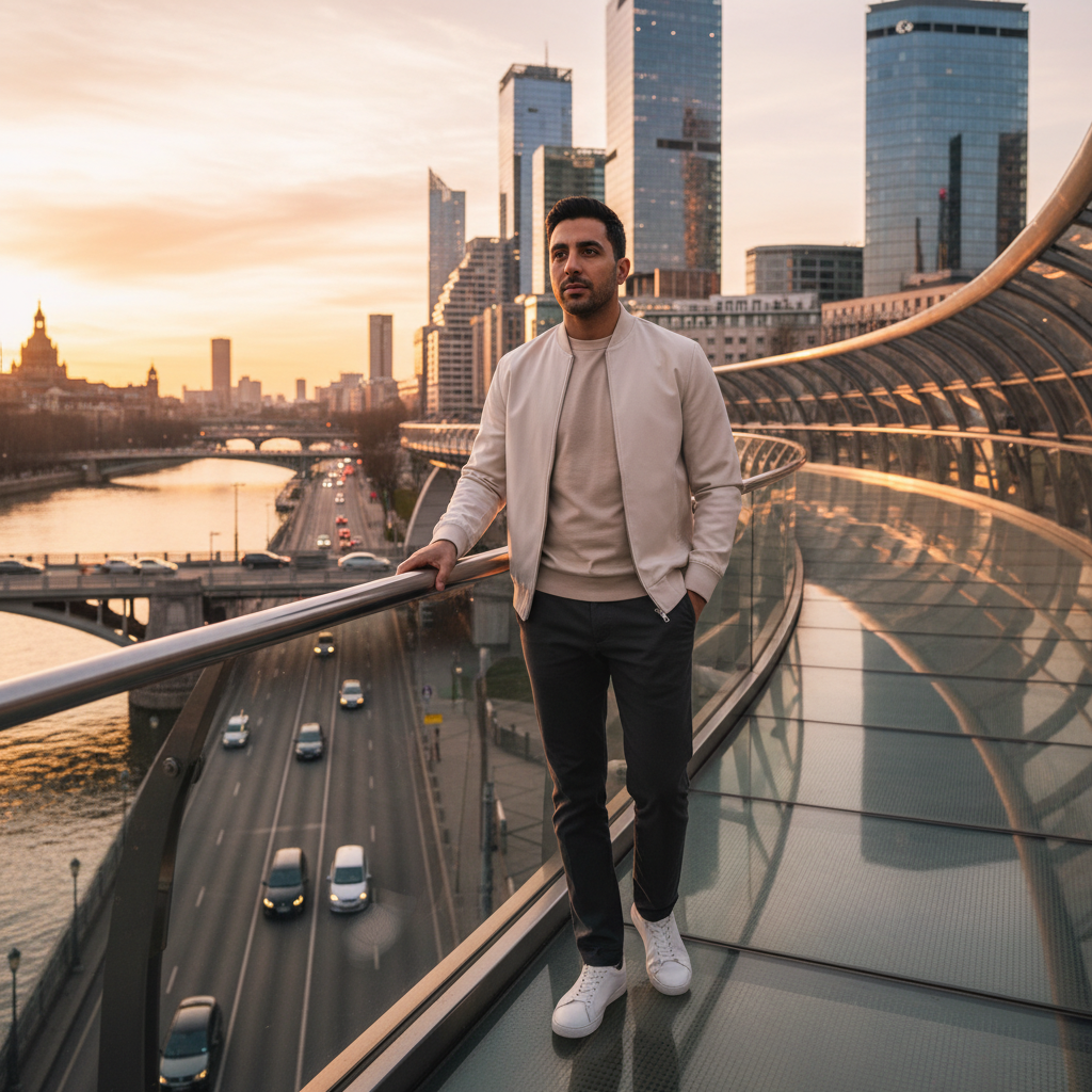 מודל גבר, לבוש ג'קט בומבר בהיר מעל חולצת טי איכותית בצבע אבן, מכנסי צ'ינו כהים, סניקרס לבנות נקיות. עומד על גשר להולכי רגל מעל נהר בעיר מודרנית, אור שקיעה עדין, אווירה אורבנית דינמית ומושכת.התמונה תכיל רק אדם אחד.