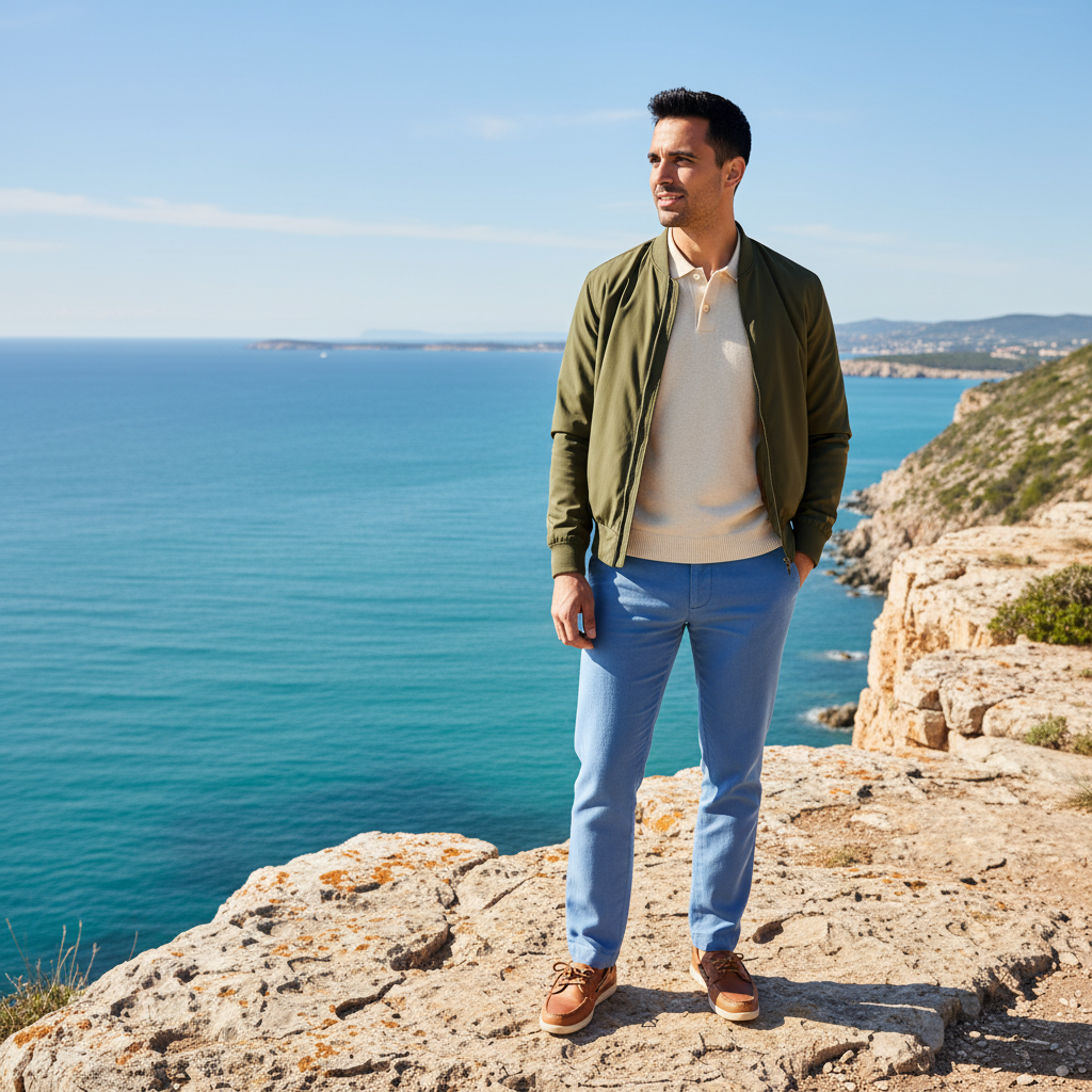 מודל גבר, ז'קט בומבר קז'ואל ירוק-זית, חולצת פולו קרם, מכנסי פשתן תכלת, נעלי סירה חומות בהירות. עומד על צוק סלעי המשקיף לים כחול-טורקיז, מואר באור שמש טבעי בהיר, אווירה רעננה, הרפתקנית ומושכת.התמונה תכיל רק אדם אחד.