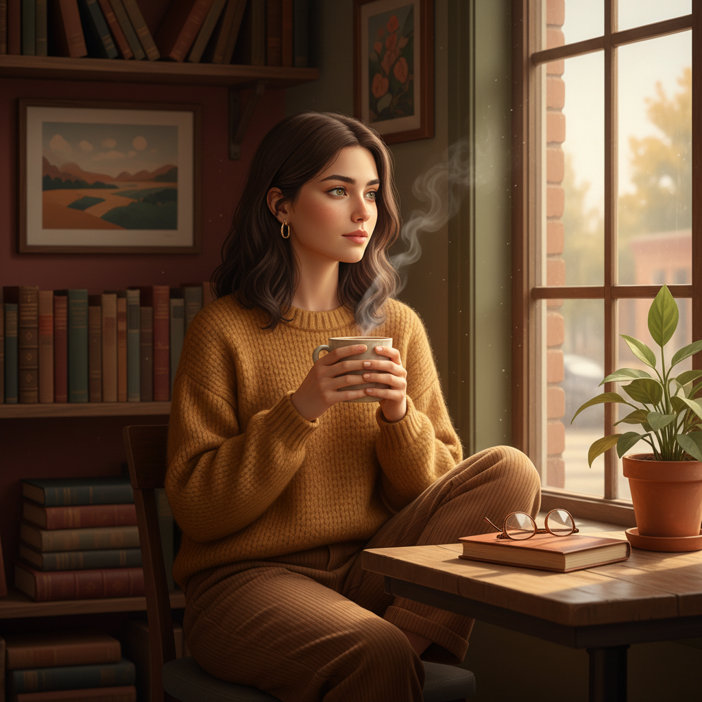 מודל אישה, לבושה בסוודר סריג רך בצבע חרדל, מכנסי קורדרוי חומים, עגילים קטנים. יושבת ליד חלון גדול בבית קפה נעים, מוארת באור יום רך, אווירה חמה ואינטלקטואלית.התמונה תכיל רק אדם אחד.