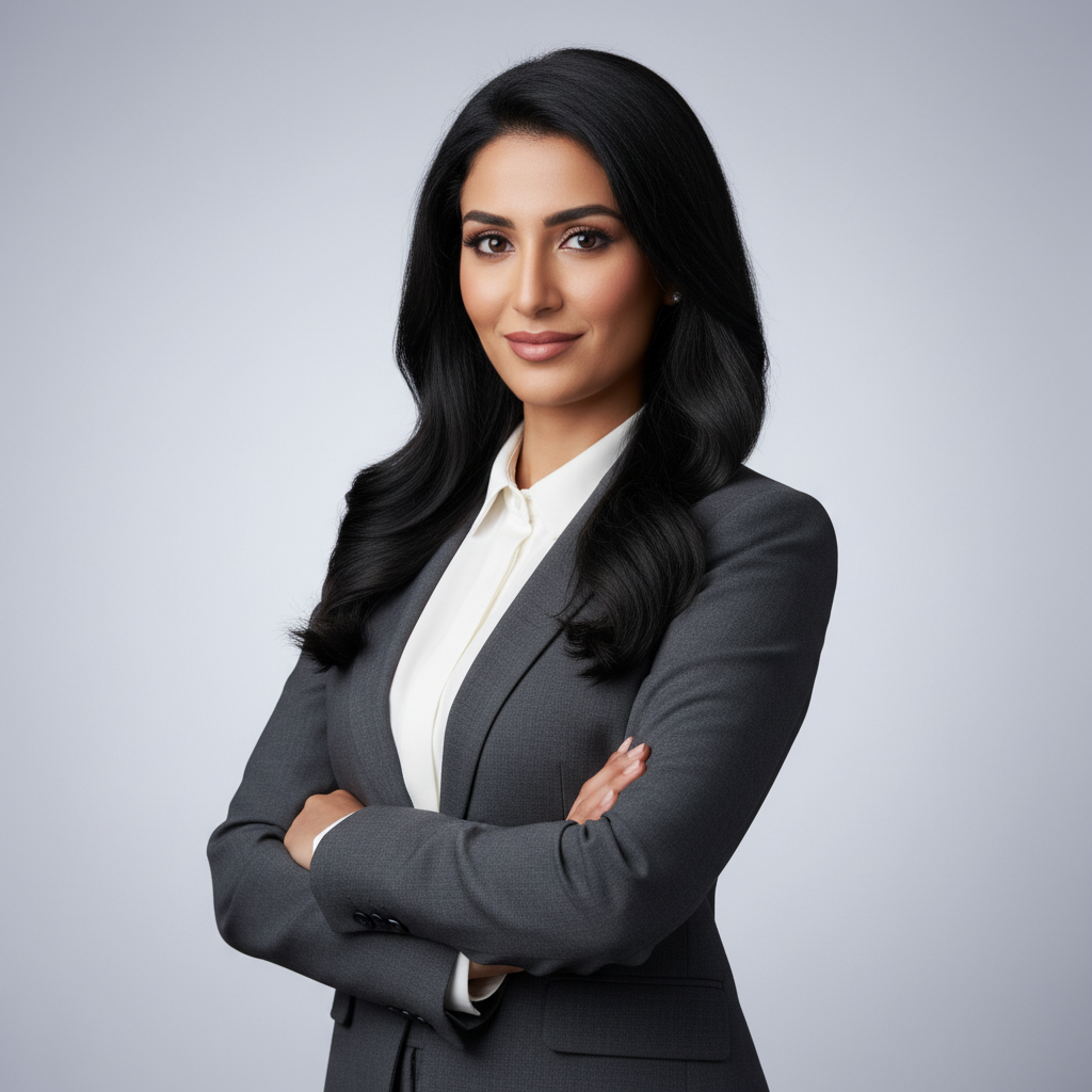 מודל אישה בצילום סטודיו מקצועי: לבוש עסקי מחוייט (בלייזר כהה, חולצה בהירה), רקע אפור בהיר ונקי, תאורת סטודיו רכה ומקצועית, אווירה סמכותית, מקצועית ואמינה.התמונה תכיל רק אדם אחד.
