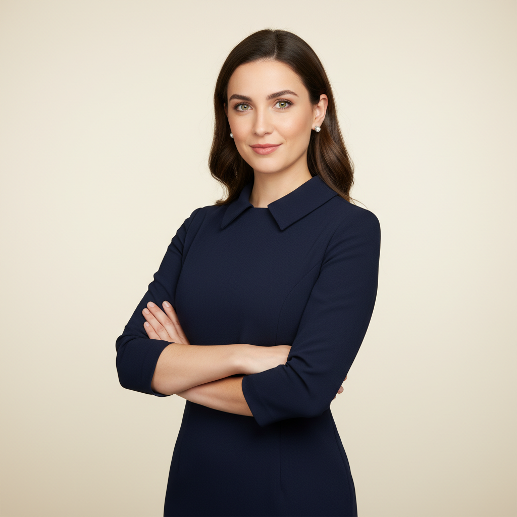 מודל אישה, לבוש עסקי אלגנטי: שמלה מחוייטת בצבע כחול נייבי עמוק, עגילים צמודים, רקע סטודיו בגוון שמנת בהיר, תאורת אולפן מדויקת ומחמיאה, אווירה סמכותית, מקצועית ואמינה.התמונה תכיל רק אדם אחד.