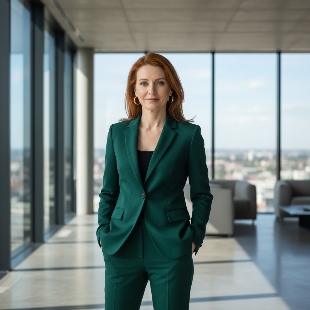 מודל אישה, חליפת מכנסיים מחויטת בגוון ירוק אמרלד עמוק עם טקסטורה עדינה, עגילים צמודים מזהב. רקע: חלל אדריכלי מודרני עם חלונות גדולים ונוף עיר מטושטש, תאורת יום טבעית מבריקה, אווירה עוצמתית ויוקרתית. התמונה תכיל רק אדם אחד.התמונה תכיל רק אדם אחד.