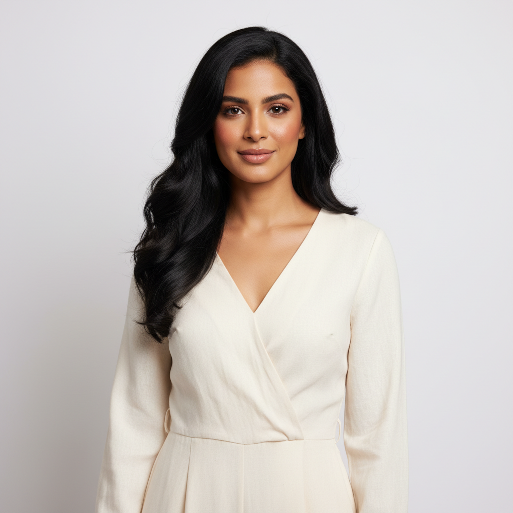 מודל אישה בצילום ביוטי מקצועי: לבוש קז'ואל-אלגנטי מינימליסטי מבד רך בצבע ניטרלי; רקע סטודיו נקי, תאורה רכה ומחמיאה, אווירה אלגנטית וטבעית.התמונה תכיל רק אדם אחד.