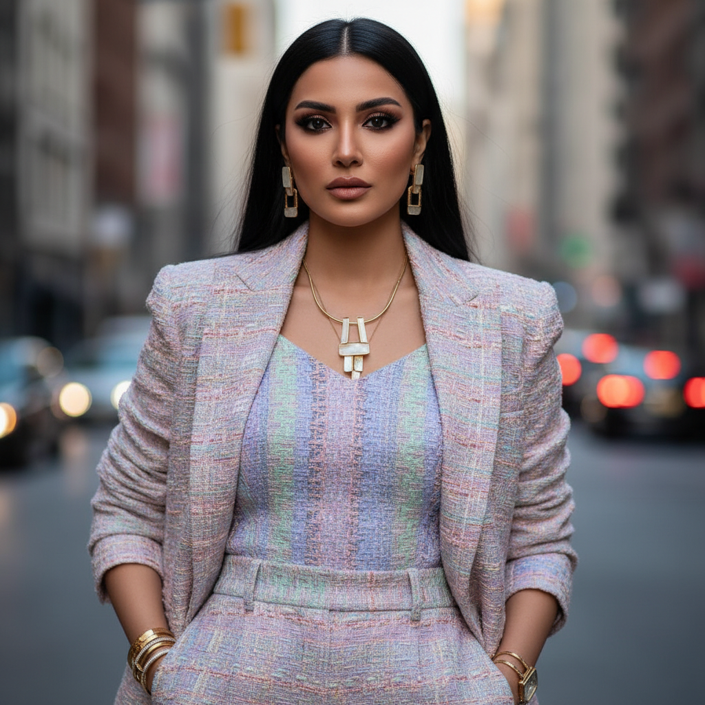 מודל אישה בצילום ביוטי: לבוש מודרני מחוייט מבד עשיר בטקסטורה בגוון פסטל, עם אביזרים גיאומטריים עדינים; רקע אורבני מטושטש, תאורה רכה מפוזרת, אווירה מתוחכמת ועוצמתית.התמונה תכיל רק אדם אחד.