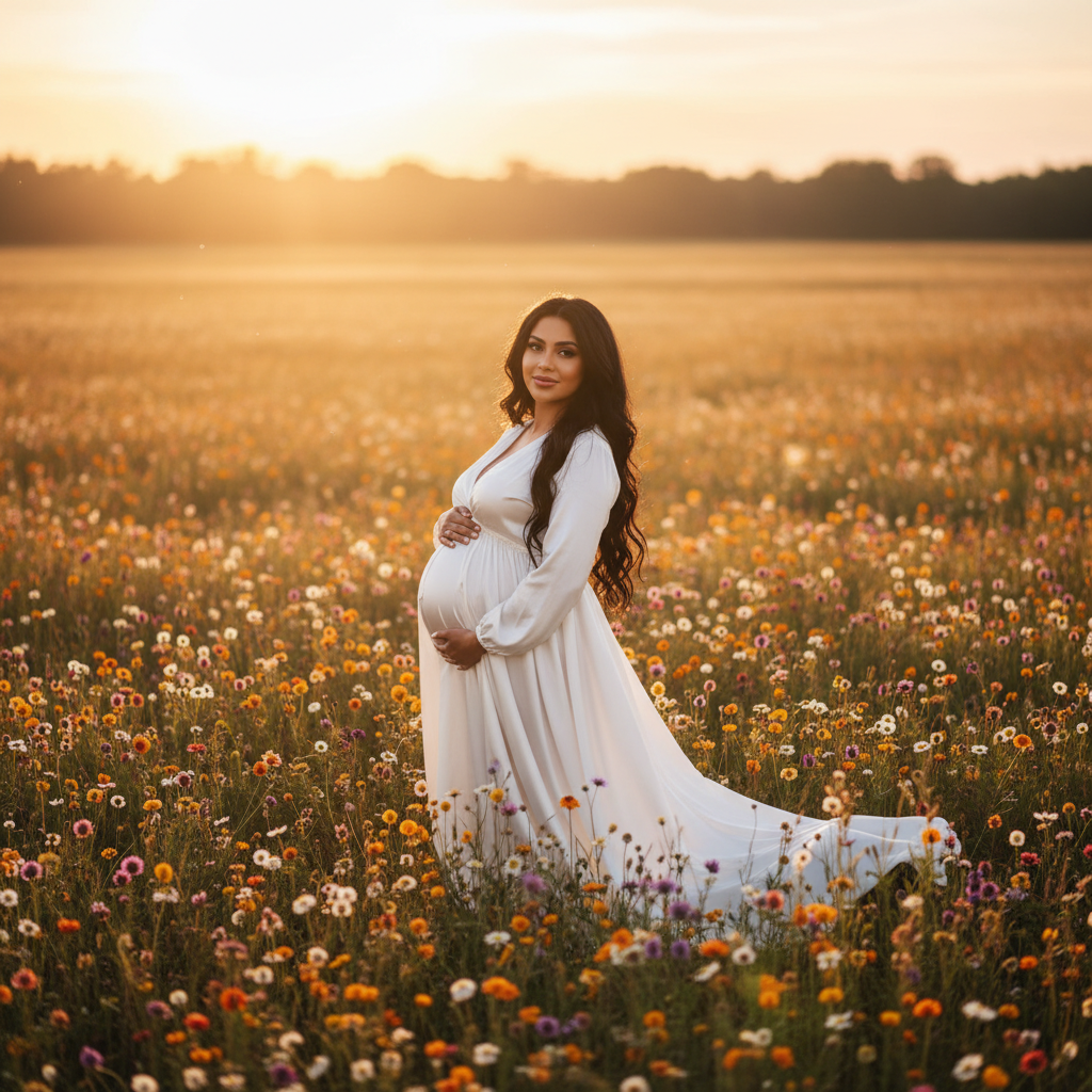 המודל ההרה, בשמלת משי לבנה וזורמת, עומדת בשדה פרחים רחב, מוארת באור שקיעה זהוב ורך, באווירה שלווה וקסומה.התמונה תכיל רק אדם אחד.