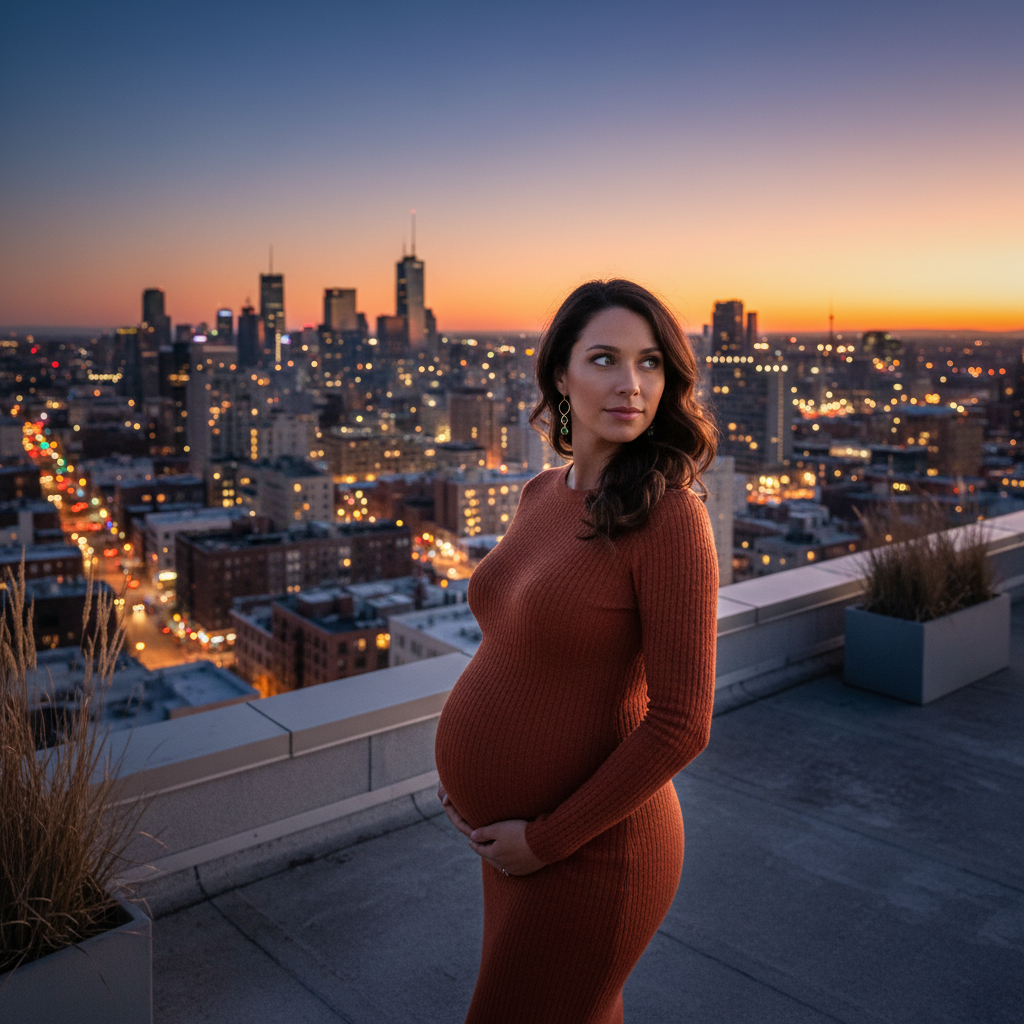 המודל ההרה, בשמלת סריג צמודה בגוון טרקוטה עם עגילים עדינים, ניצבת על גג בניין עירוני בשעת בין ערביים, מוארת באורות העיר המנצנצים, באווירה קוסמופוליטית ודרמטית.התמונה תכיל רק אדם אחד.