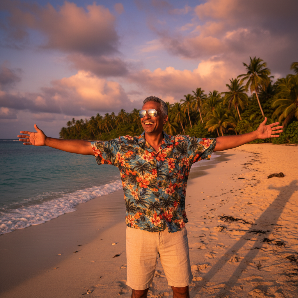 מודל גבר, לבוש חולצת הוואי צבעונית וקצרה, מכנסי שורט בהירים, משקפי שמש, על רקע חוף טרופי בשעת שקיעה, תאורה חמה, אווירה פרועה וקלילה.התמונה תכיל רק אדם אחד.