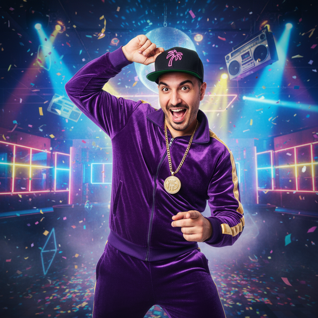 מודל גבר, חליפת טרנינג קטיפה נוצצת, שרשרת זהב, כובע מצחייה, במועדון לילה שנות ה-80, אורות ניאון, תאורה צבעונית, אווירה פרועה וקומית.התמונה תכיל רק אדם אחד.