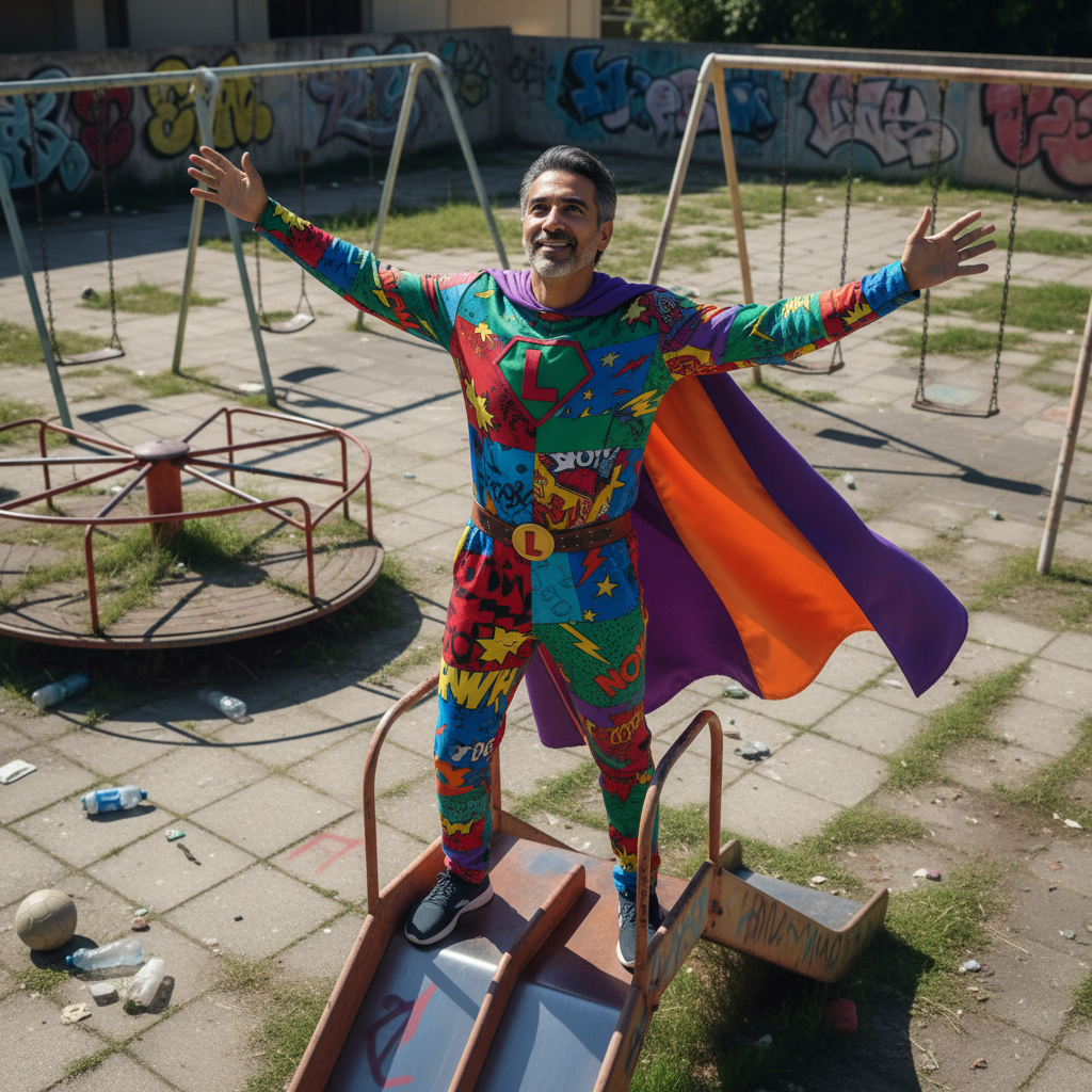 מודל גבר, תחפושת גיבור-על צבעונית עם גלימה, בתוך מגרש משחקים נטוש, תאורת יום בהירה, אווירה קומית ופרועה.התמונה תכיל רק אדם אחד.