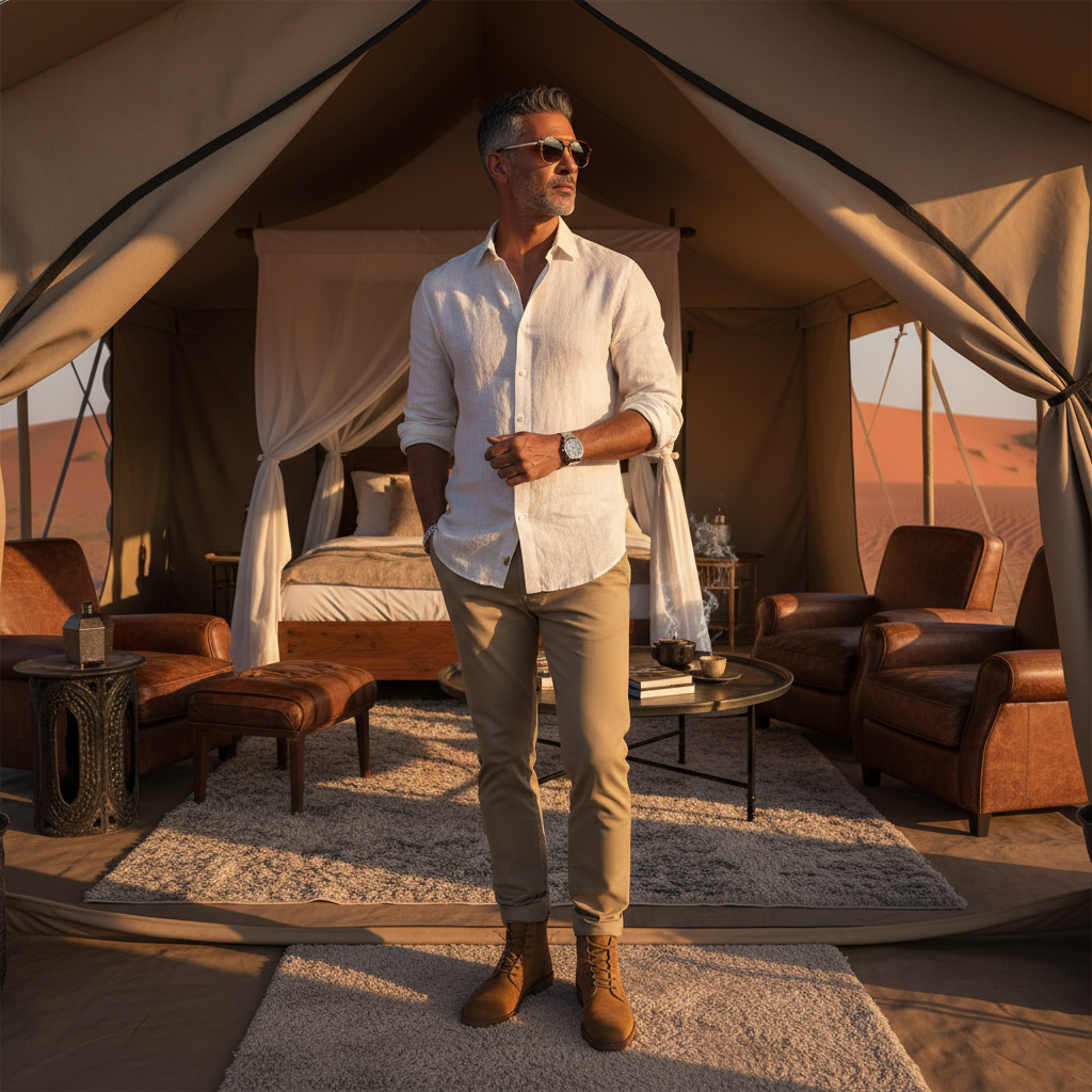 מודל גבר, לבוש קז'ואל-יוקרתי, חולצת פשתן מכופתרת עם שרוולים מגולגלים, מכנסי צ'ינו בהירים, מגפיים בסגנון מדברי, משקפי שמש אופנתיים, באוהל גלאמפינג מפואר במדבר, תאורת שקיעה חמה, אווירה הרפתקנית ויוקרתית.התמונה תכיל רק אדם אחד.