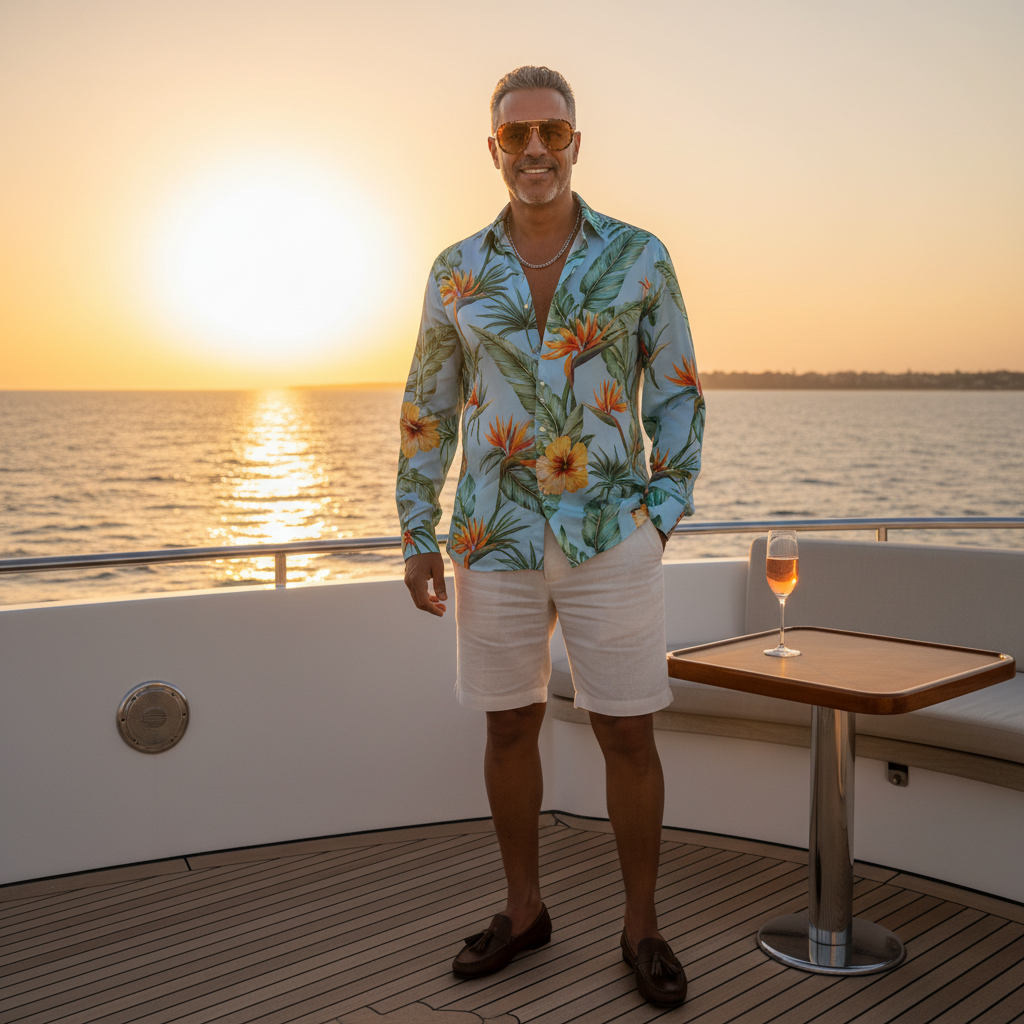 מודל גבר, חולצת משי בהירה עם הדפס טרופי, מכנסי פשתן קצרים בהירים, נעלי מוקסין אופנתיות, משקפי שמש יוקרתיים, על סיפון יאכטה מפוארת בלב ים, תאורת שקיעה זהובה, אווירת חופשה חגיגית וזוהרת.התמונה תכיל רק אדם אחד.