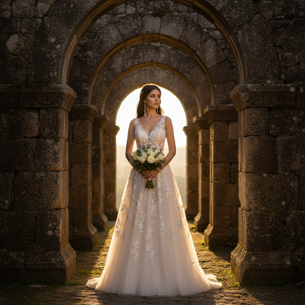 מודל אישה, בשמלת כלה A-line בצבע שמנת עם רקמת פרחים עדינה, עגילים ארוכים פנינה, ניצבת במעבר קשתות אבן עתיק, תאורת שמש זהובה דרך הקשתות, אווירה היסטורית ורומנטית.התמונה תכיל רק אדם אחד.