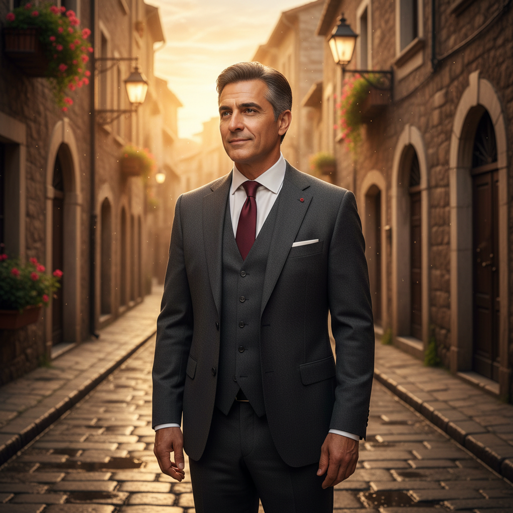 מודל גבר, בחליפת שלושה חלקים אפורה-כהה מבד צמר, חולצה לבנה מכופתרת, עניבת משי צרה בגוון בורדו, ניצב ברחוב מרוצף אבן בעיר אירופאית עתיקה, תאורת שקיעה חמה וזהובה, אווירה קלאסית ורומנטית.התמונה תכיל רק אדם אחד.