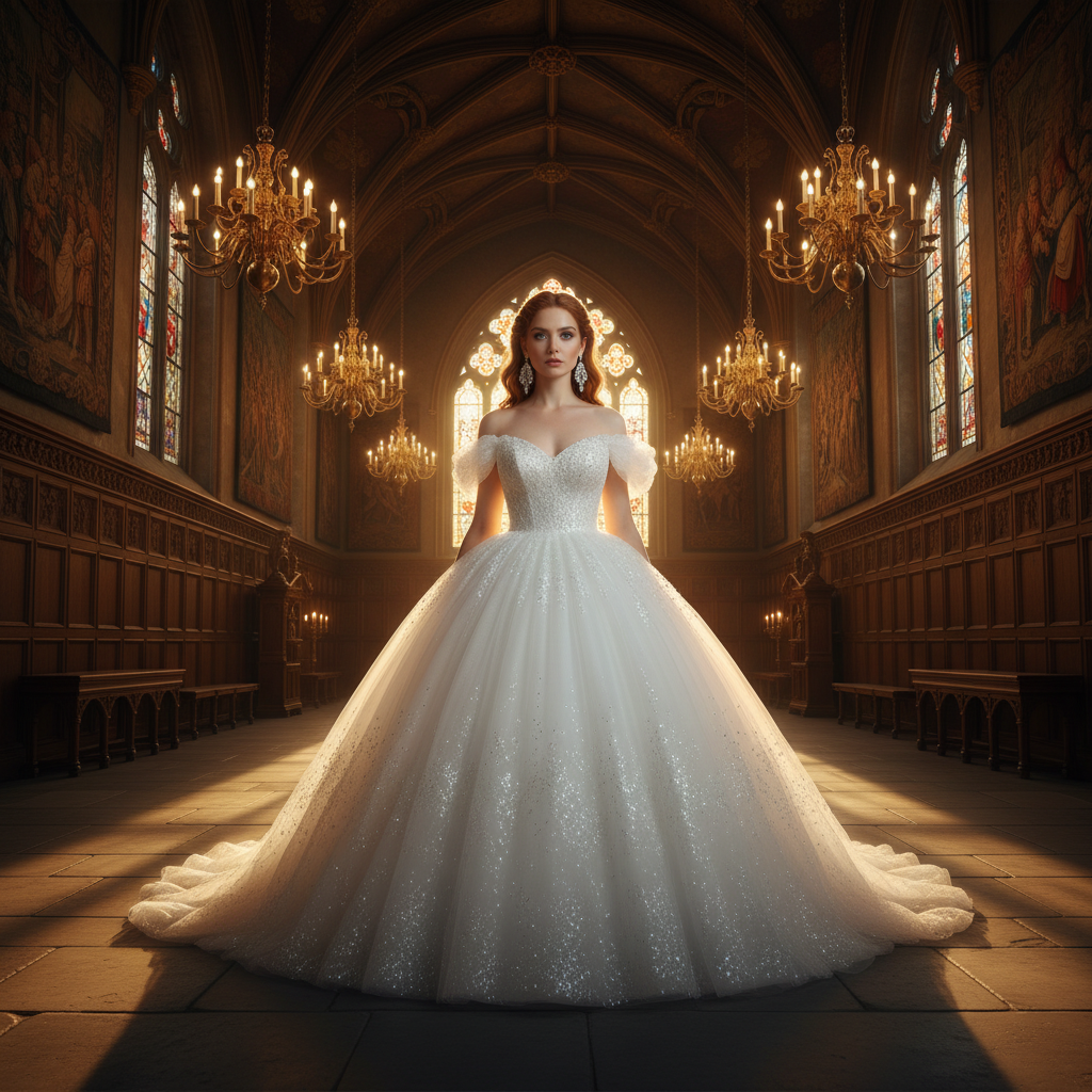 המודל, בשמלת כלה נסיכותית מנפחת מבד טול לבן עם פאייטים עדינים, כתפיות חשופות ועגילים נוצצים, ניצבת באולם נשפים מפואר בטירה עתיקה, מוארת בתאורת נברשות חמה ויוקרתית, אווירה מלכותית ודרמטית.התמונה תכיל רק אדם אחד.