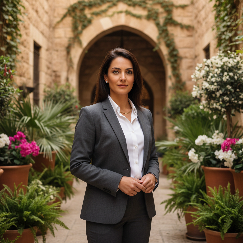 מודל אישה, לבושה חליפת מכנסיים מחויטת בצבע אפור-פחם, חולצה מכופתרת לבנה, תכשיטים מינימליים, עומדת בחצר פנימית ירושלמית אלגנטית עם אבן חשופה ועציצים ירוקים, באור יום רך המדגיש מקצועיות וניסיון.התמונה תכיל רק אדם אחד.