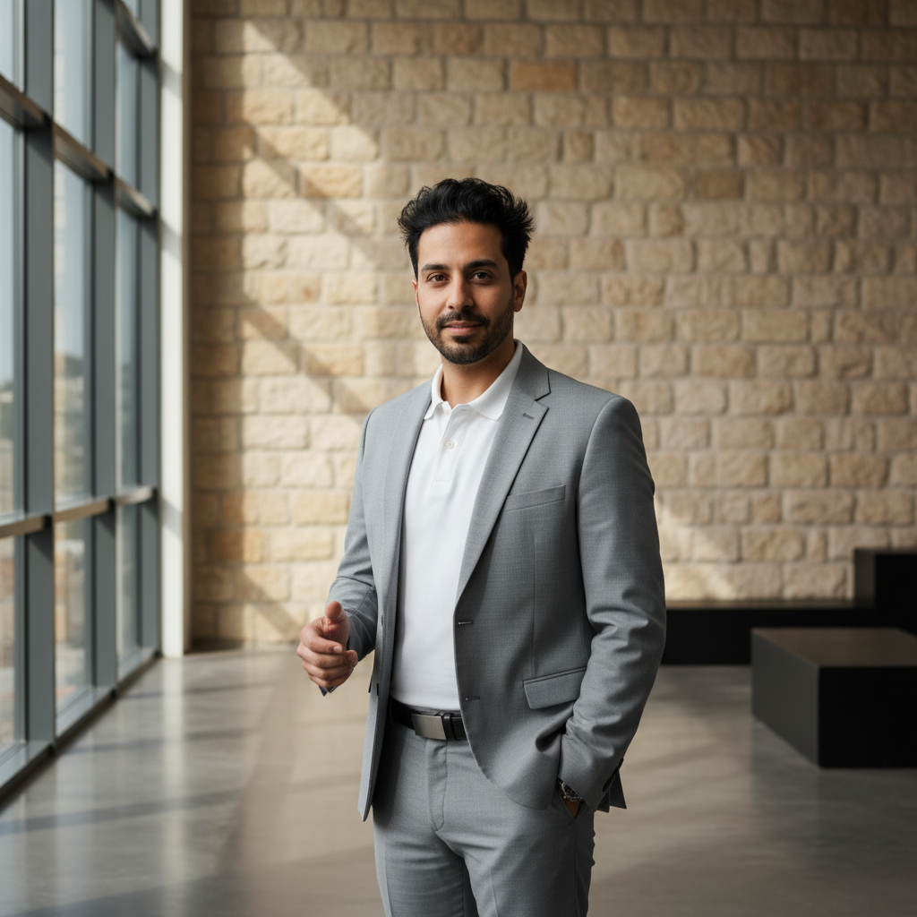 מודל גבר, לבוש ז'קט מחויט בצבע אפור בהיר מעל חולצת פולו לבנה נקייה, ניצב בסטודיו מודרני מואר היטב עם קיר אבן ירושלמית חשוף, בתאורת יום רכה המדגישה יצירתיות ודינמיות. התמונה תכיל רק אדם אחד.התמונה תכיל רק אדם אחד.