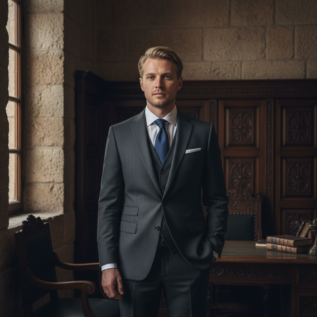 מודל גבר, לבוש חליפת שלושה חלקים צמר אפור פחם, עניבה משי כהה ומטפחת כיס מוקפדת, ניצב בפנים מבנה ירושלמי קלאסי עם קירות אבן כהה ועץ מגולף, בתאורת חלון רכה ודרמטית המדגישה עומק אינטלקטואלי ונוכחות.התמונה תכיל רק אדם אחד.