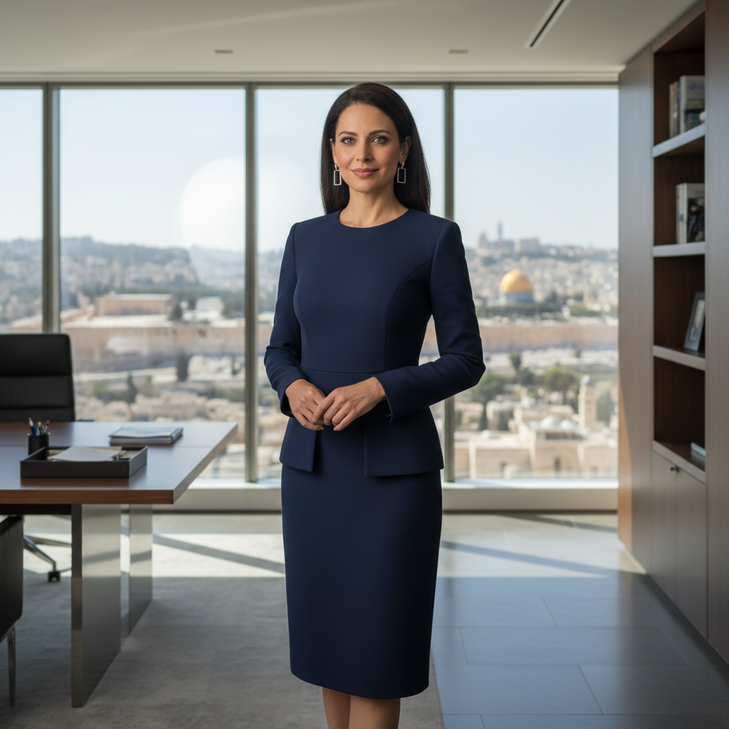 מודל אישה, לבושה שמלת מידי מחויטת כחול נייבי מבד מט, עגילים צמודים; רקע: פנים משרד יוקרתי ומודרני, חלונות גדולים המשקיפים לנוף ירושלמי מרוחק; תאורת יום בהירה, אווירת ביטחון ומנהיגות.התמונה תכיל רק אדם אחד.