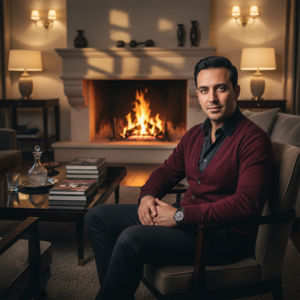 המודל, גבר, לבוש חולצה מכופתרת כהה אלגנטית ומעליה סריג קשמיר רך בצבע בורדו, יושב בסלון מעוצב עם אח בוער, תאורה עדינה ואווירה חמה ורומנטית.התמונה תכיל רק אדם אחד.