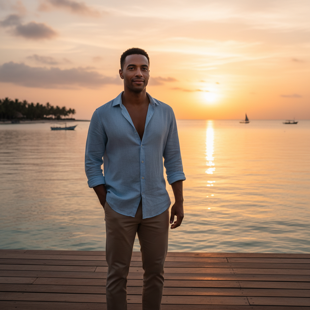 מודל, גבר, בלבוש קז'ואל אלגנטי, חולצת פשתן בהירה פתוחה ומכנסיים בצבע חול, עומד על דק עץ מול ים שקט בשקיעה זהובה, בתאורה טבעית חמה ובאווירה שלווה ורומנטית.התמונה תכיל רק אדם אחד.