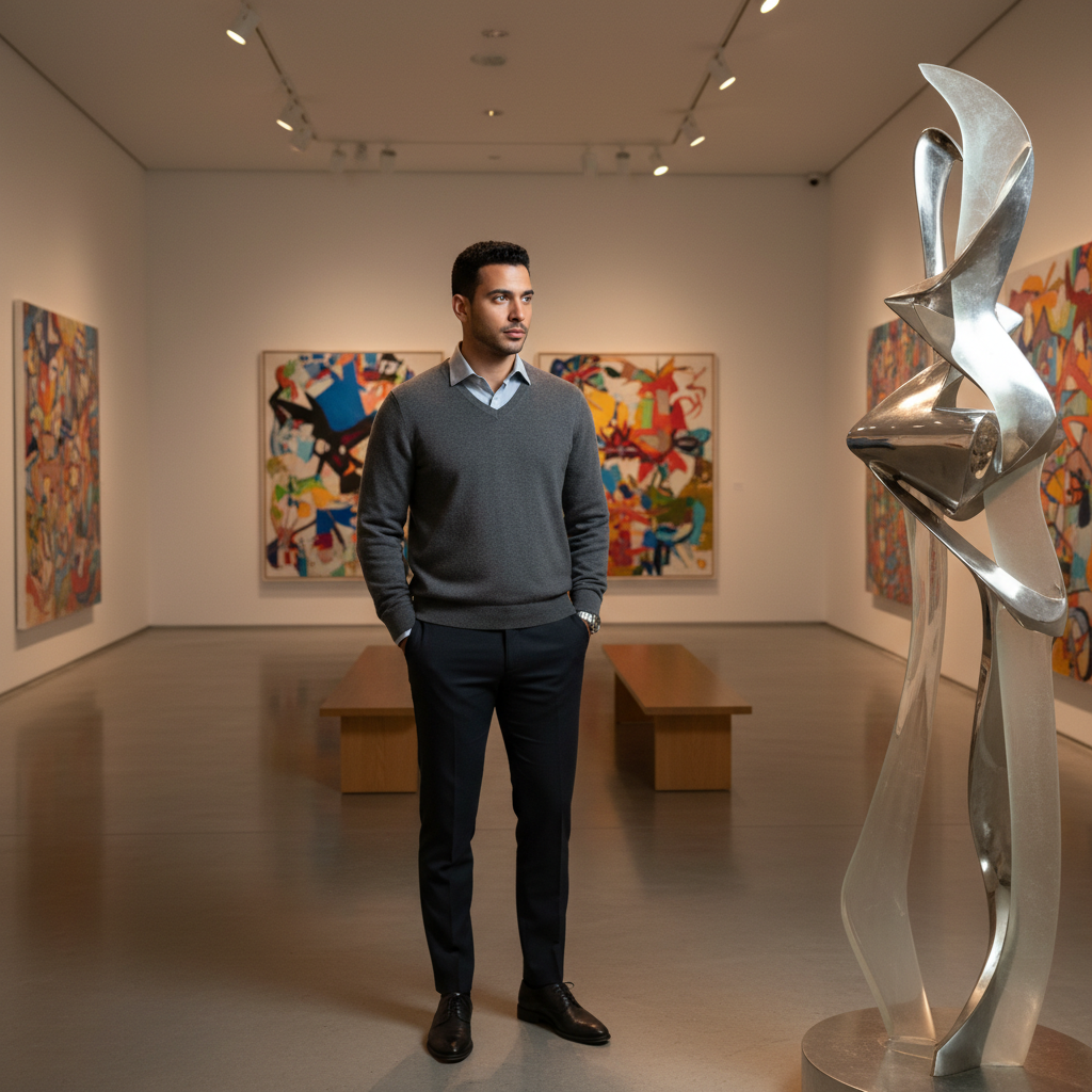 מודל, גבר, לבוש סריג גולף בצבע פחם ומכנסיים כהים בגזרה צרה, עומד בגלריה לאמנות מודרנית מוארת בפנסי ספוט רכים, אווירה מתוחכמת ורומנטית.התמונה תכיל רק אדם אחד.
