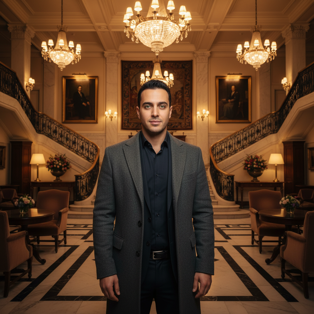 מודל, גבר, לבוש מעיל צמר אלגנטי בצבע אפור-פחם מעל חולצה מכופתרת כהה, עומד בלובי מלון יוקרתי קלאסי, מואר על ידי נברשות זהב, עם מדרגות שיש מרשימות ברקע, אווירה דרמטית, חמה ויוקרתית.התמונה תכיל רק אדם אחד.