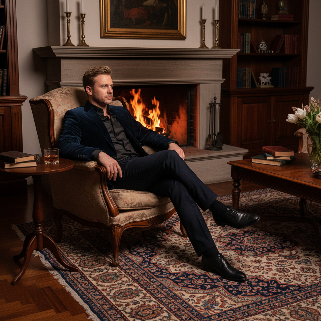 מודל, גבר, לבוש ז'קט קטיפה כחול עמוק, חולצת משי שחורה ומכנסיים כהים, יושב ליד אח בוערת בחדר סלון מפואר, מואר באור חם ורך של האש, אווירה אינטימית, יוקרתית ונינוחה.התמונה תכיל רק אדם אחד.