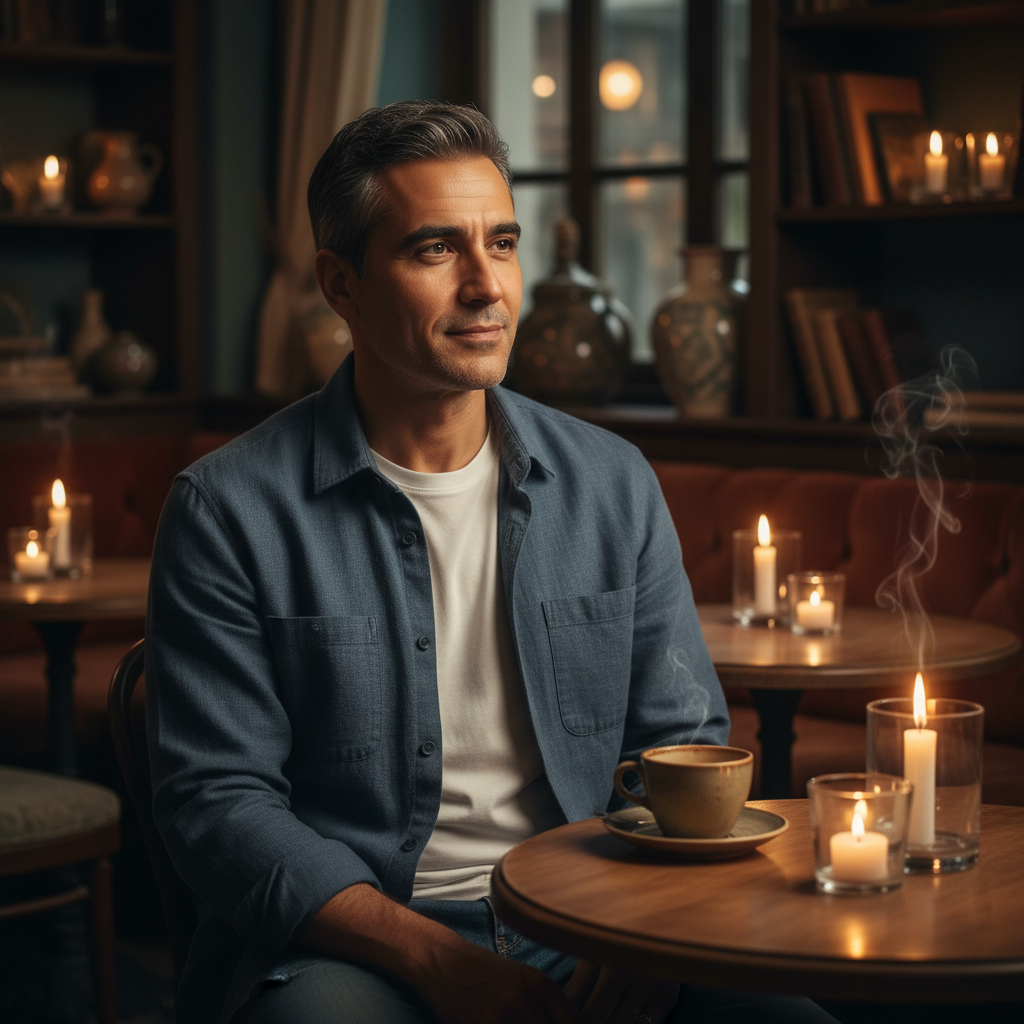 מודל, גבר, לבוש חולצה מכופתרת פתוחה מעל טישירט איכותית, בצבעי אפור-כחול, יושב בבית קפה בוטיק מואר באור עמום של שעת ערב, עם תאורת נרות, אווירה חמה ואינטימית.התמונה תכיל רק אדם אחד.