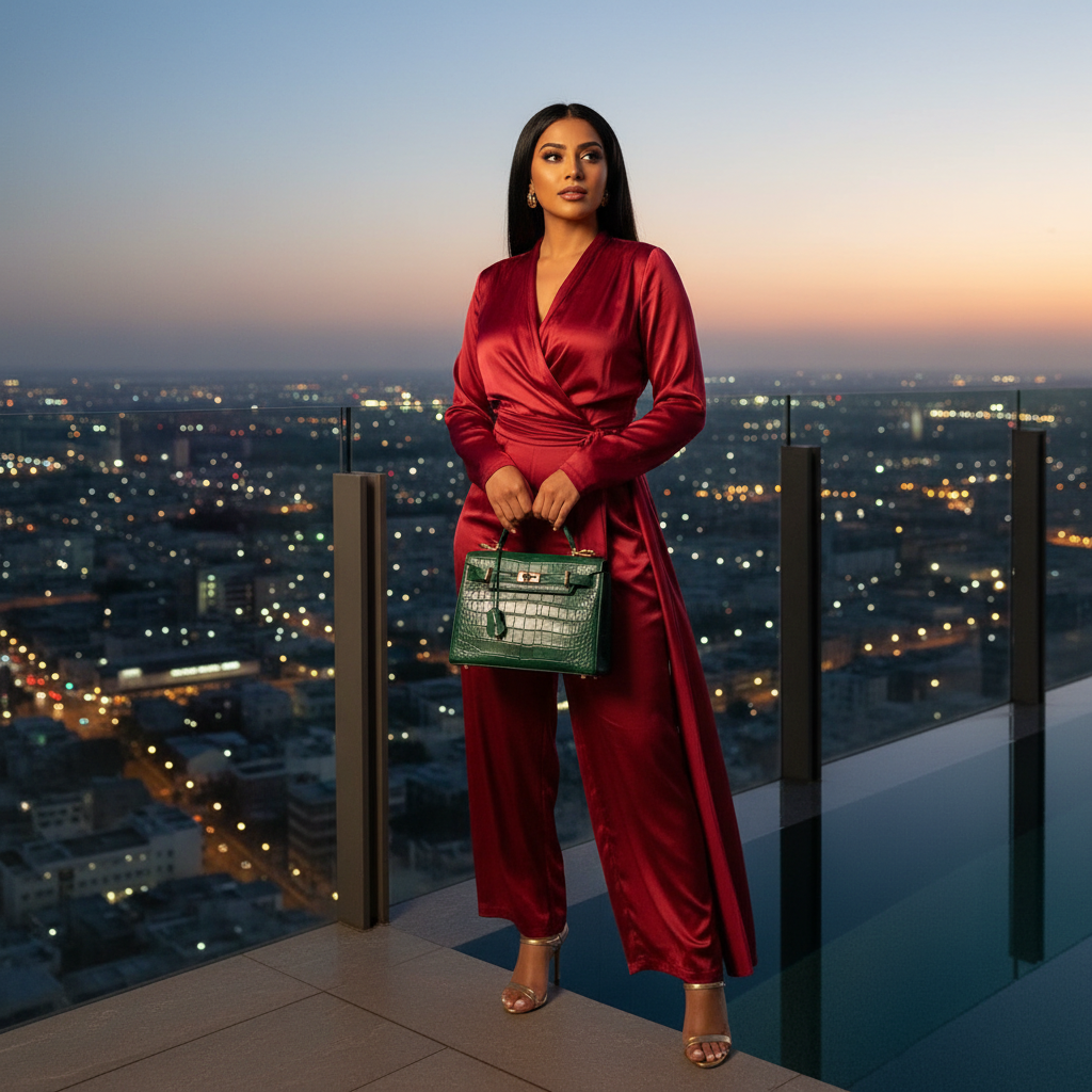 מודל אישה באוברול משי יוקרתי בגוון רובי, עקבים, תיק מעצבים; גג בניין עם בריכת אינסוף, נוף אורות עיר מנצנצים; תאורת ערב עשירה, אווירת יוקרה אורבנית, ביטחון.התמונה תכיל רק אדם אחד.