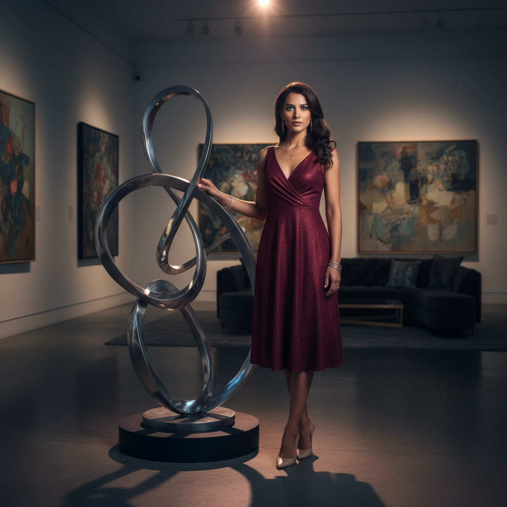 מודל אישה, שמלת קוקטייל בורגונדי אלגנטית, עקבים, תכשיטים עדינים; גלריית אמנות יוקרתית, פסל מודרני מואר; תאורת ספוט חדה, אווירה מתוחכמת, יוקרתית ומעוררת השראה.התמונה תכיל רק אדם אחד.