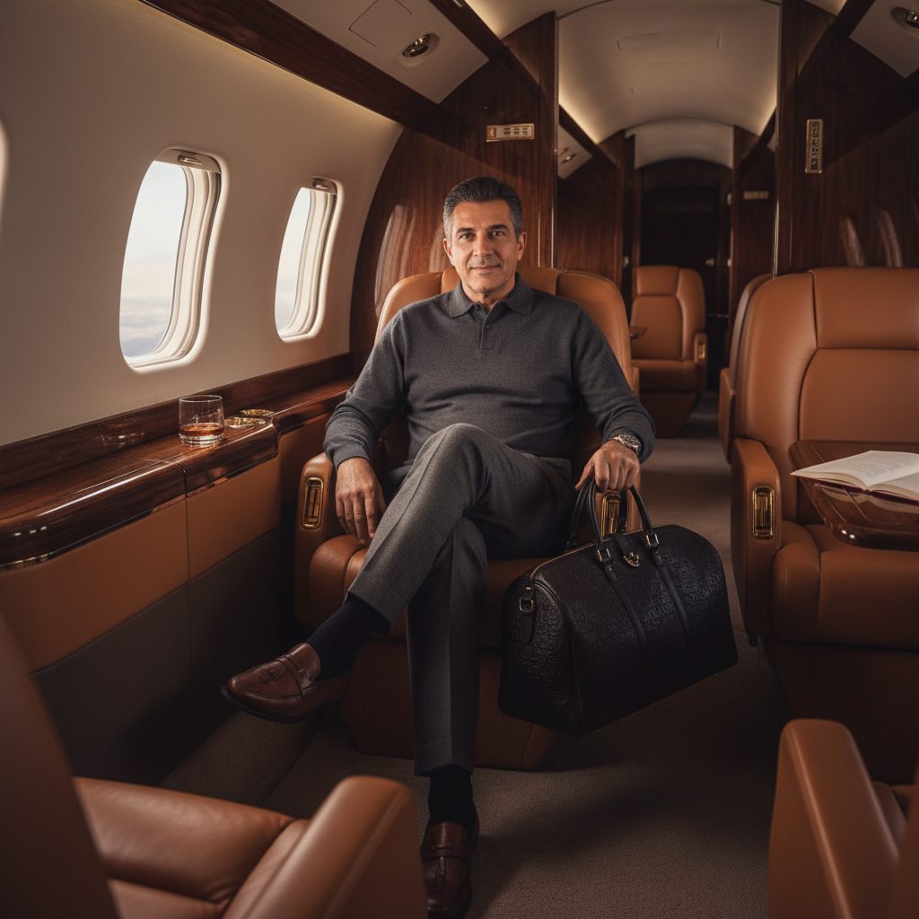 מודל גבר, חולצת פולו מבד קשמיר כהה, מכנסי צמר מוקפדים, נעלי עור איטלקיות ותיק נסיעות מעוצב; פנים מטוס מנהלים יוקרתי עם עור ועץ מלוטש, תאורה רכה וממוקדת, אווירת פרטיות, הצלחה ושפע.התמונה תכיל רק אדם אחד.