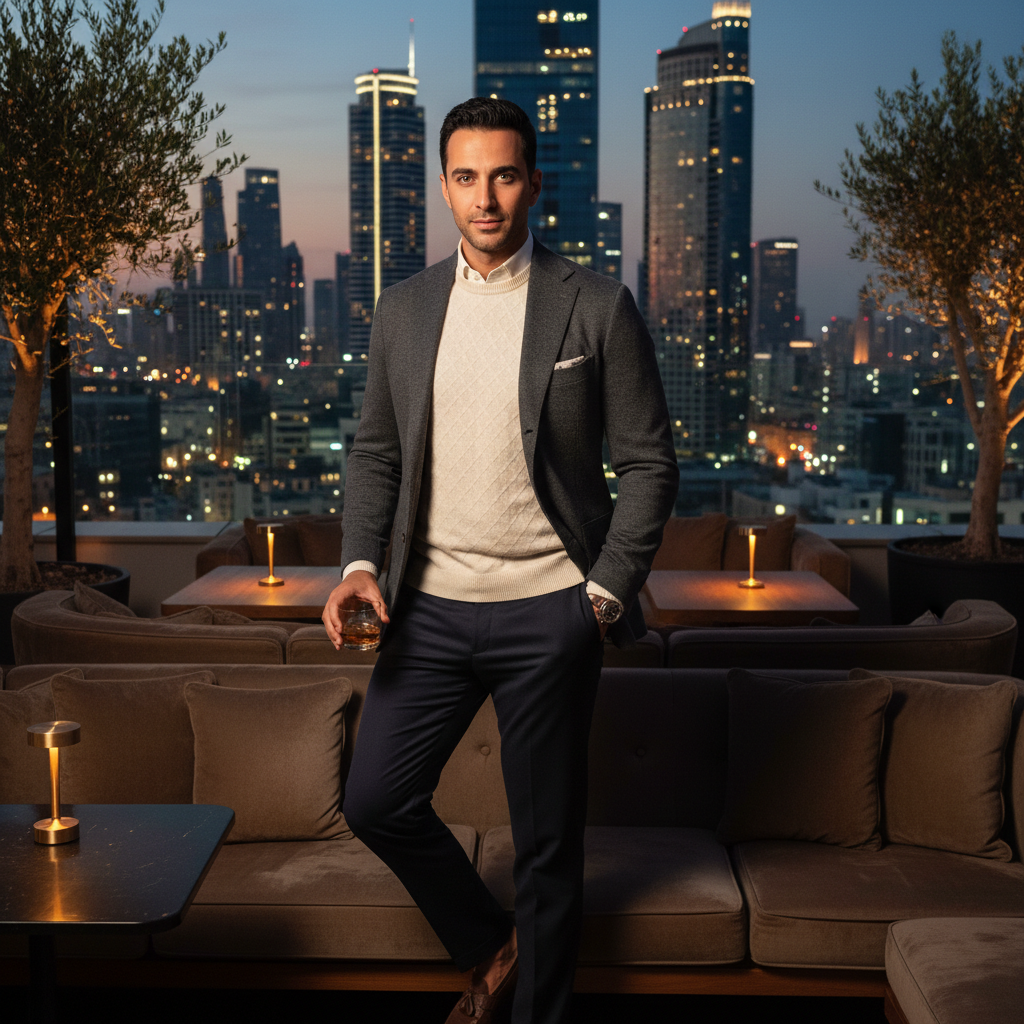 מודל גבר, בלייזר קשמיר כהה מחויט, גולף סריג יוקרתי, מכנסיים כהים; בר גג יוקרתי עם נוף אורבני מואר, תאורת ערב רכה, אווירה מתוחכמת ואלגנטית.התמונה תכיל רק אדם אחד.