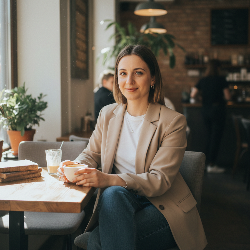 מודל אישה, בלייזר בהיר מעל חולצת טי בייסיק, ג'ינס כהה, תכשיט מינימלי, יושבת בבית קפה מואר היטב, אור טבעי רך, אווירה כנה ומזמינה.התמונה תכיל רק אדם אחד.