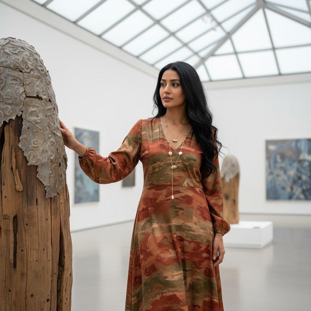 מודל אישה, שמלת מידי זורמת בגוון אדמה, משי, שרשרת עדינה; גלריה לאמנות מודרנית, אור טבעי מפוזר, אווירה רגועה ומלאת עניין.התמונה תכיל רק אדם אחד.