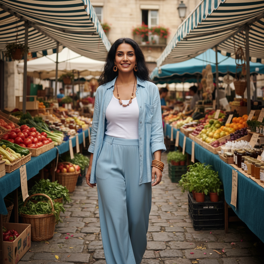 מודל אישה, חולצת פשתן מכופתרת פתוחה מעל גופייה לבנה, מכנסי קרפ תואמים בצבע תכלת, תכשיטי עץ עדינים; שוק איכרים פתוח ותוסס, אור שמש בהיר ומפוזר, אווירה קלילה ומלאת אנרגיה.התמונה תכיל רק אדם אחד.