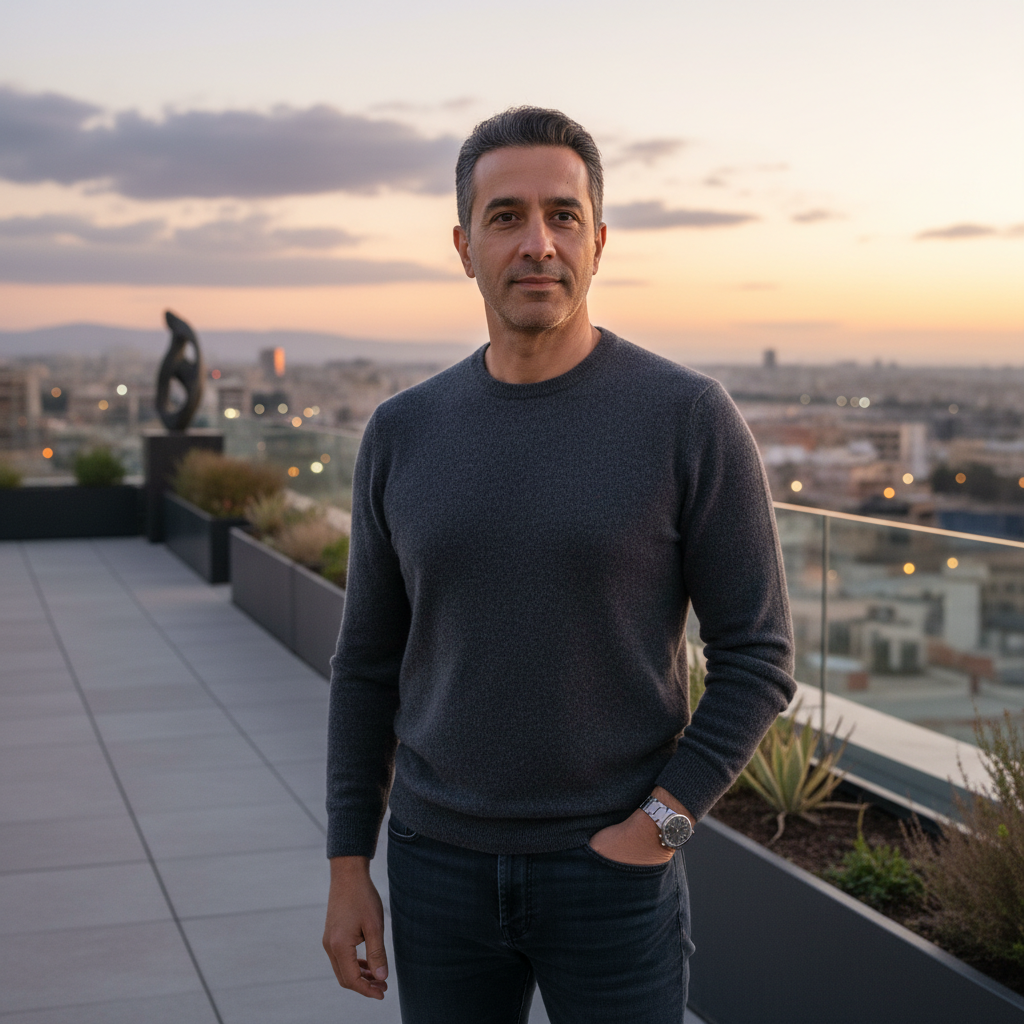 מודל גבר, סריג כהה בטקסטורת קשמיר עדינה, מכנסי ג'ינס כהים ומחוייטים, שעון כסוף מינימליסטי; עומד במרפסת גג אורבנית בשעת ערב מוקדמת, אור רך של שקיעה ואורות עיר ראשונים, אווירה מודרנית ורגועה.התמונה תכיל רק אדם אחד.