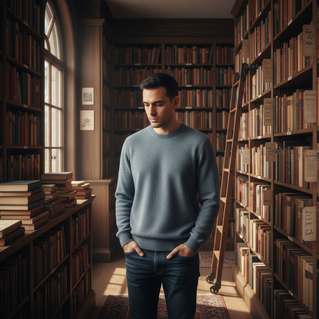 מודל גבר, סוודר קשמיר רך בצבע אפור-כחול, מכנסי ג'ינס כהים; עומד בין מדפים עמוסים בספרים בחנות ספרים וינטג', אור טבעי חמים, אווירה שקטה ומהורהרת.התמונה תכיל רק אדם אחד.