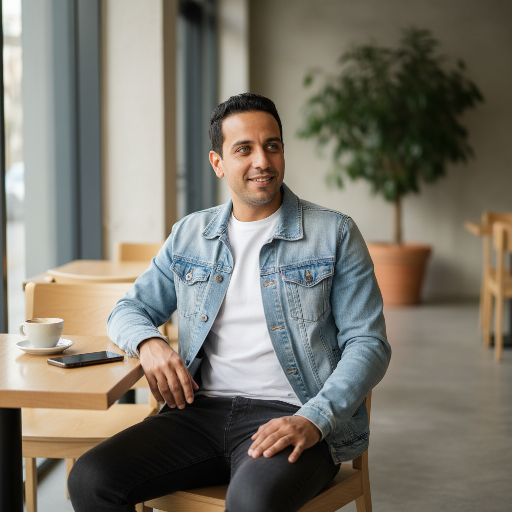 המודל (גבר), לבוש קז'ואל-אורבני: ג'ינס כהה, טי-שירט לבנה, ז'קט ג'ינס כחול פתוח, יושב בבית קפה מודרני מואר באור טבעי רך, אווירה נינוחה ואותנטית.התמונה תכיל רק אדם אחד.