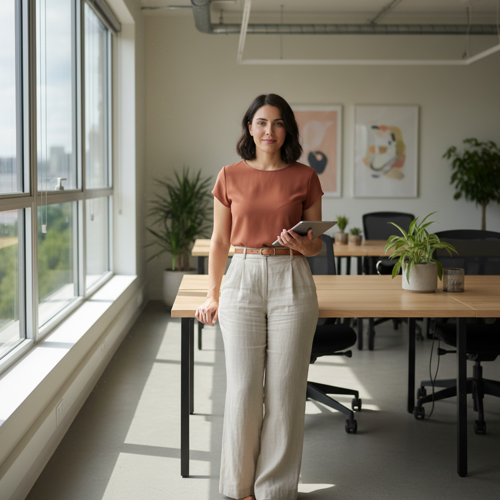 המודל (אישה) לבושה בסגנון סמארט-קז'ואל: מכנסי פשתן רחבים בצבע אבן, טופ מחוייט בטון אדמה וחגורה מינימליסטית, בסביבת משרד מודרני מואר באור טבעי, אווירה נינוחה ומקצועית.התמונה תכיל רק אדם אחד.