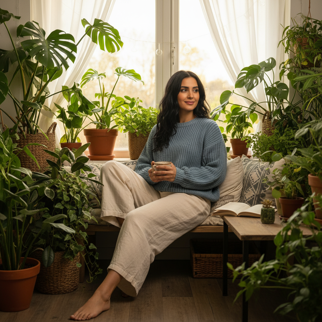 מודל (אישה), לבושה בסוודר צ'אנקיי סרוג רך בגוון תכלת-אפרפר, מכנסיים רחבים מכותנה בהירה, יושבת בפינת קפה ביתית עם שפע צמחים, מוארת באור טבעי מפוזר, אווירה חמה ונינוחה.התמונה תכיל רק אדם אחד.