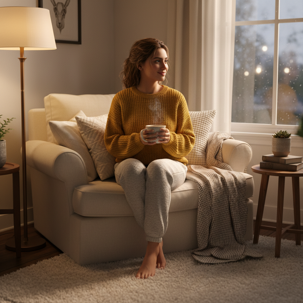 המודל (אישה), לבושה בסוודר סרוג עבה בצבע חרדל ומכנסיים רכים מבד פליס בצבע אפור בהיר, עם כוס קפה ביד, בפינת ישיבה ביתית מוארת באור רך וחמים, אווירה נעימה ומזמינה.התמונה תכיל רק אדם אחד.