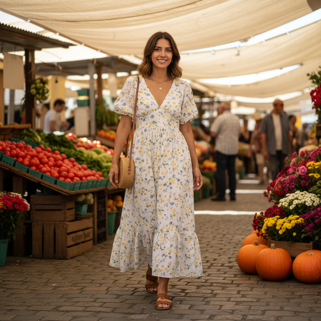 המודל (אישה), לבושה בשמלת מקסי קיצית מבד כותנה בהיר בהדפס פרחים עדין, סנדלי עור שטוחים ותיק קש קטן, משוטטת בשוק איכרים צבעוני באור יום שמשי, אווירה קלילה ושמחה.התמונה תכיל רק אדם אחד.