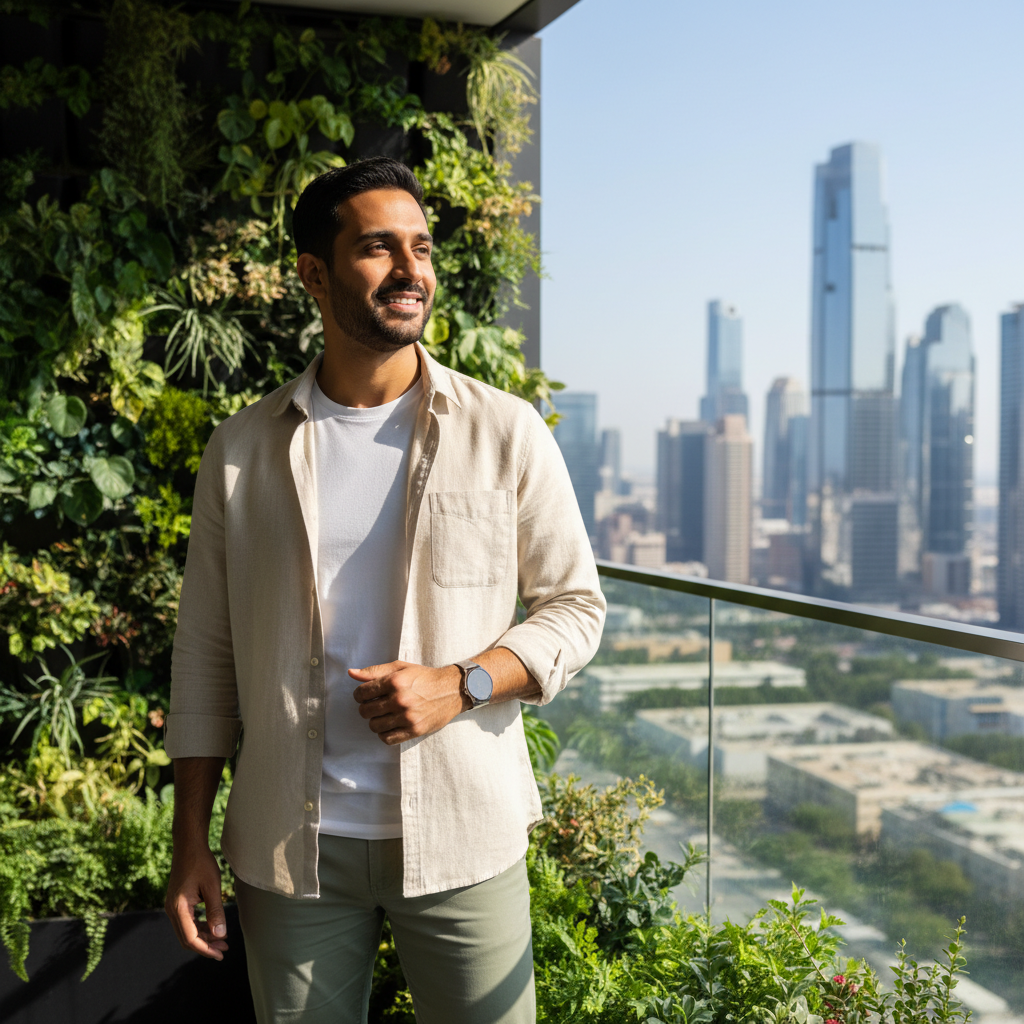 המודל, גבר, בלבוש קז'ואל-עסקי מודרני: חולצת פשתן בהירה פתוחה מעל טי-שירט לבנה, מכנסי צ'ינו בהירים, שעון מינימליסטי; על מרפסת עסקית ירוקה עם נוף אורבני ברור, תאורת יום טבעית, אווירה יזמית ואופטימית.התמונה תכיל רק אדם אחד.