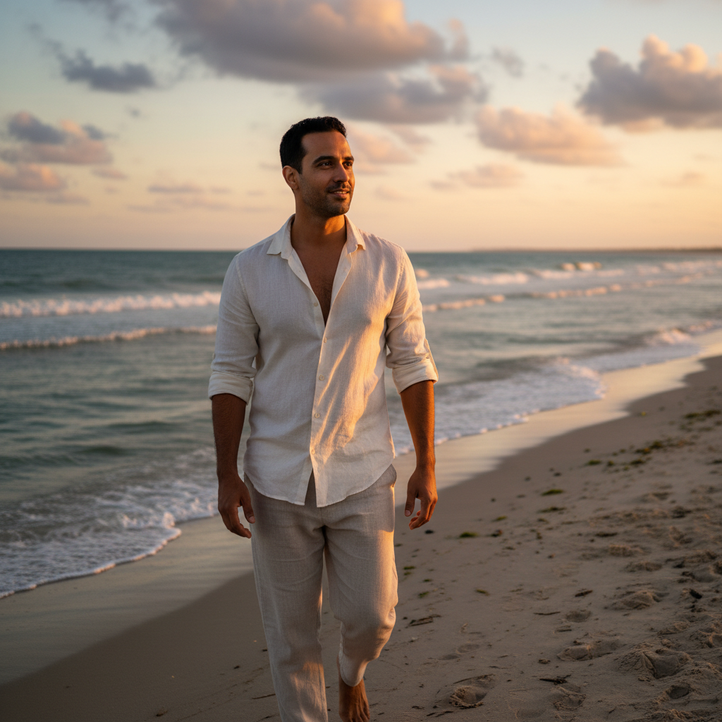 מודל גבר, לבוש קז'ואל-רומנטי בחולצה פתוחה בהירה ובמכנסי פשתן רפויים, צועד בחוף ים פתוח, אור טבעי רך בשעת שקיעה, אווירה נינוחה ואותנטית.התמונה תכיל רק אדם אחד.