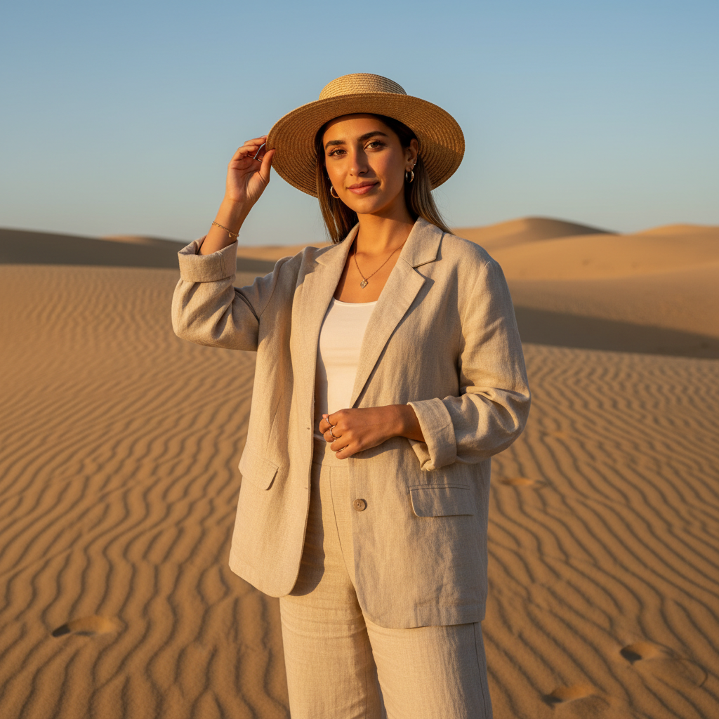 מודל אישה, לבושה חליפת פשתן קלילה בגוון חול, תכשיטי זהב עדינים, במדבר זהוב פתוח, תאורת שמש חמה של אחר הצהריים, אווירה הרפתקנית ורגועה.התמונה תכיל רק אדם אחד.
