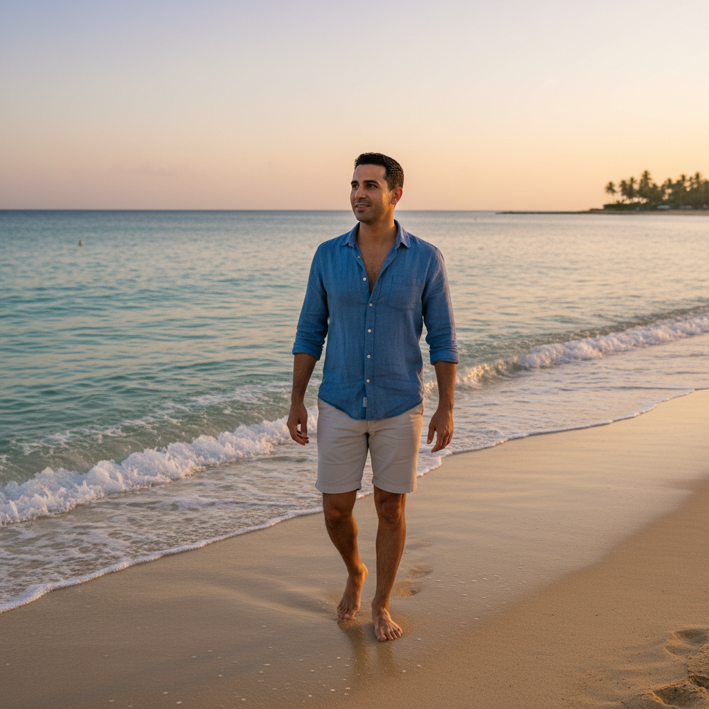 מודל גבר, חולצת פשתן כחולה פתוחה, מכנסי ברמודה בהירים, חוף ים חולי, גלים שקטים, אור שקיעה רך, אווירה שלווה ומרעננת.התמונה תכיל רק אדם אחד.
