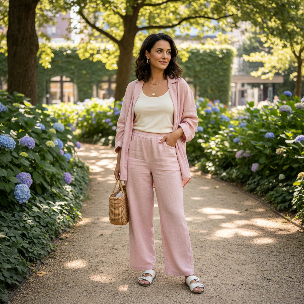 מודל אישה, לבושה סט קז'ואל מודרני (מכנסיים רחבים, גופייה), גווני פסטל רכים, טקסטורת פשתן, בפארק אורבני ירוק, אור יום צלול, אווירה אופנתית ונינוחה.התמונה תכיל רק אדם אחד.
